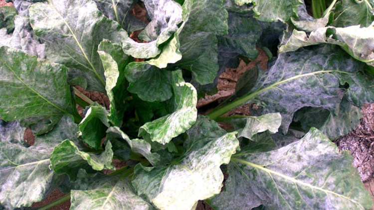 Echte meeldauw in bieten. In de vroegste fase van de ziekte komt echte meeldauw op afzonderlijke planten voor. Onder gunstige omstandigheden kan de schimmel zich vervolgens snel verspreiden over een heel bietenperceel. De aanwezigheid van de schimmel op het bietengewas vermindert de werking van chlorofyl in het blad en veroorzaakt daardoor opbrengstverliezen.