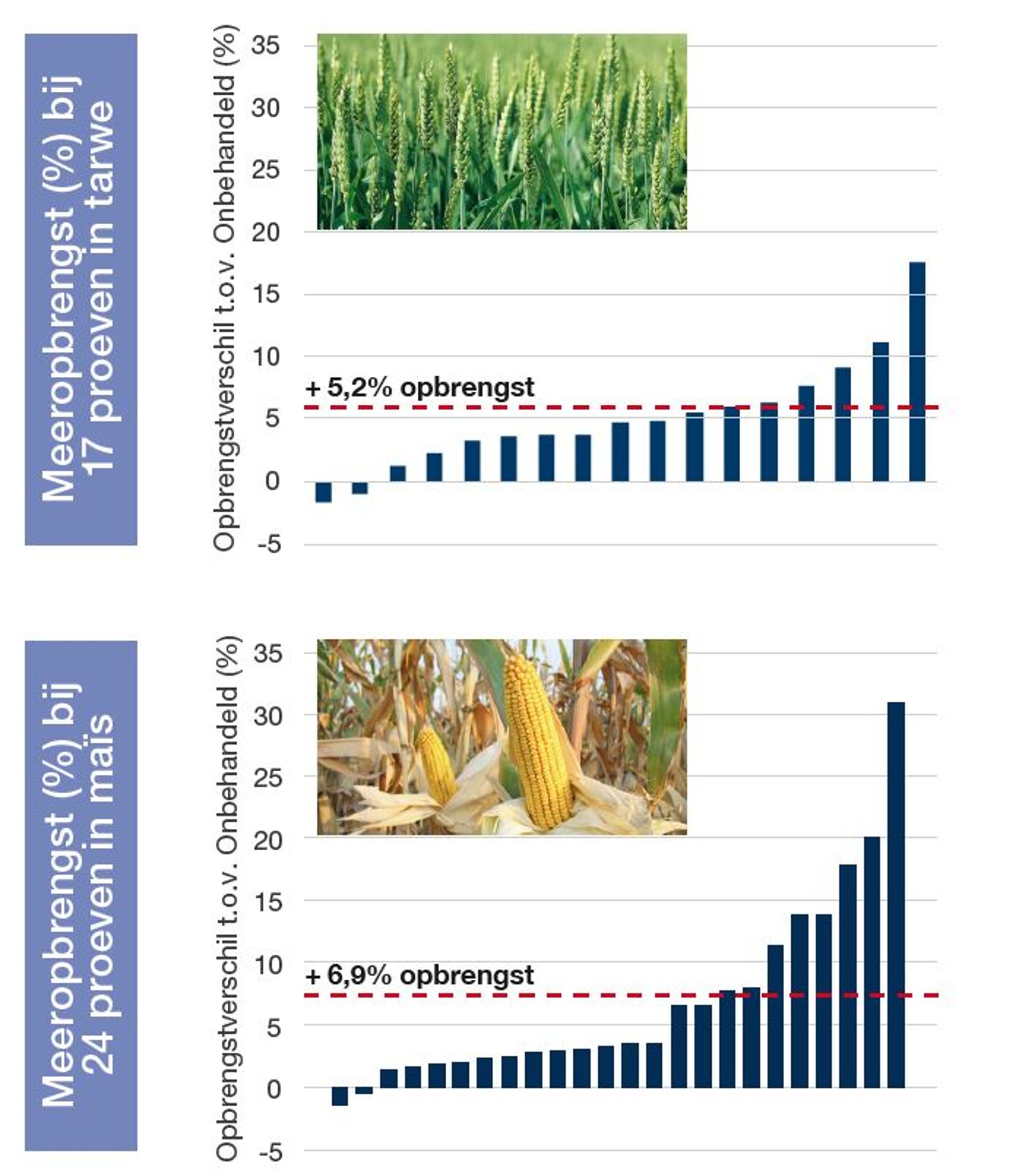 Proefresultaten laten een stijging zien in gemiddelde gewasopbrengst van 5,2% voor wintertarwe en 6,9% voor maïs.