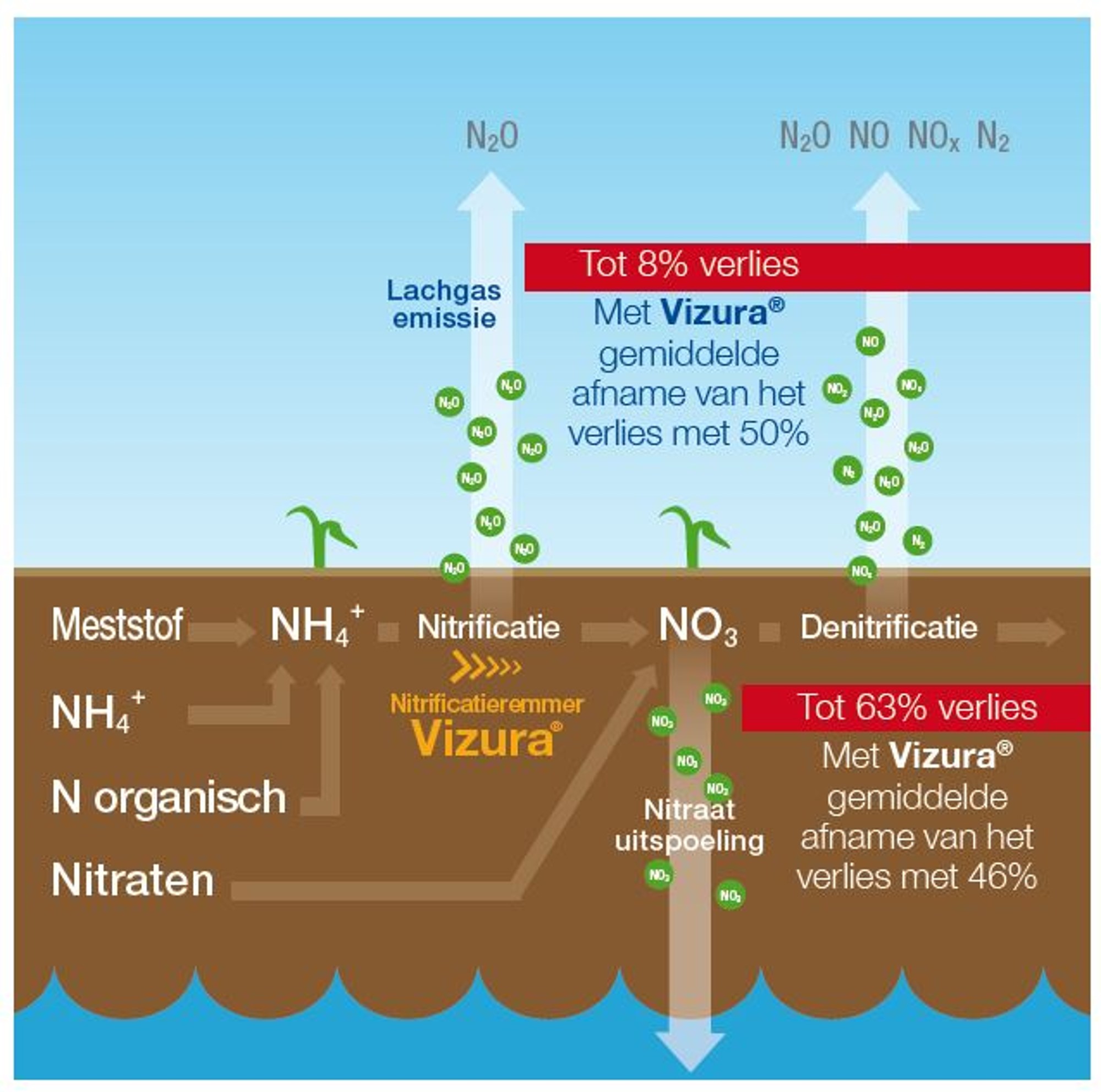 Door Vizura®, een nitrificatieremmer, toe te voegen aan meststoffen op basis van ammonium, wordt deze ammonium over een langere periode gestabiliseerd en worden bijgevolg N2O-verliezen door vervluchtiging met gemiddeld 50% beperkt en wordt het risico op nitraatuitspoeling met gemiddeld 46% verminderd.