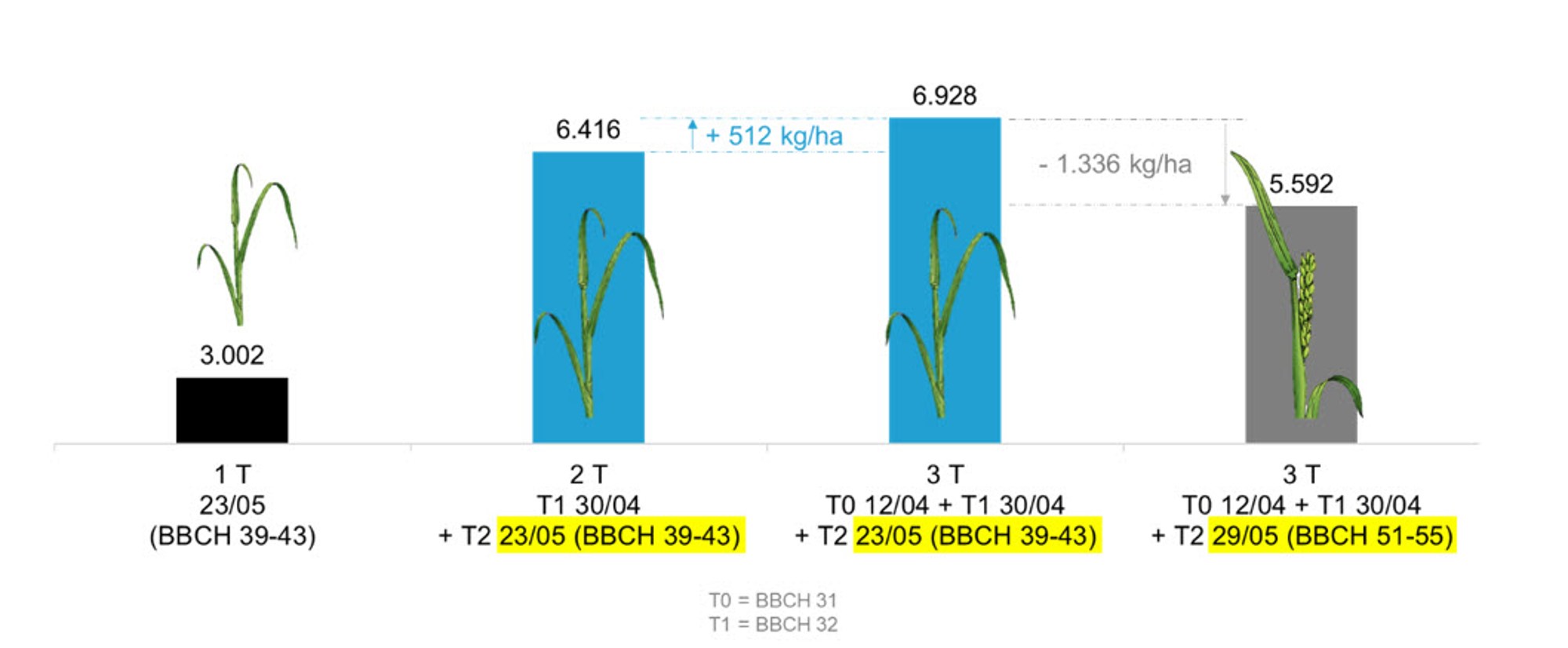De twee laatste bladeren, die zich net voor de aar bevinden, dragen voor meer dan 60 % bij aan de korrelvulling en dus aan de uiteindelijke opbrengst. Het is daarom van cruciaal belang om ze goed en snel te beschermen. Het wordt aangeraden om niet te wachten tot de aren volledig uit zijn om de zogenaamde T2-behandeling uit te voeren, maar om te behandelen tussen het stadium van het laatste blad ontvouwen en het stadium zwelling (BBCH 39-41).
