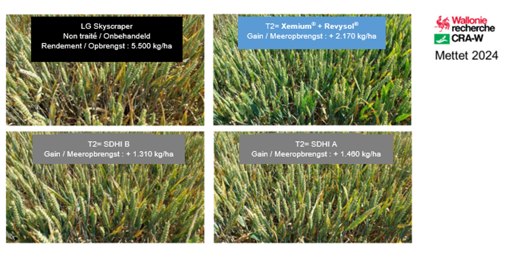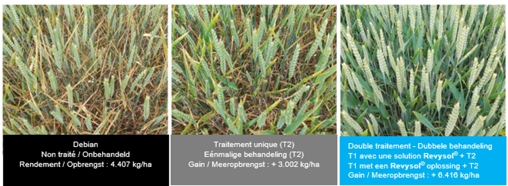 Vanwege de sterke ziektedruk (voornamelijk septoria en roest) was de bijdrage van de eerste behandeling in 2024 net zo belangrijk als die van de tweede behandeling. De meeropbrengst die de oplossingen op basis van Revysol® hebben geleverd zoals Balaya®, Lenvyor® + Simveris®, Navura®, Revylfex® Trio of Xenial® in de eerste behandeling, overschreden in de proeven uitgevoerd door Redebel in Obaix meer dan drie ton per hectare.